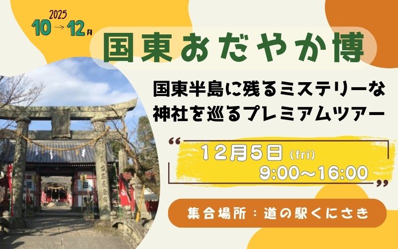9:00開始・講座 道の駅くにさき → 八幡奈多宮 → 安岐町と武蔵町の神社 → 桜八幡神社 → 赤松厳島神社 → 国見町の神社 → 粟嶋神社 → 道の駅くにさき 16:00